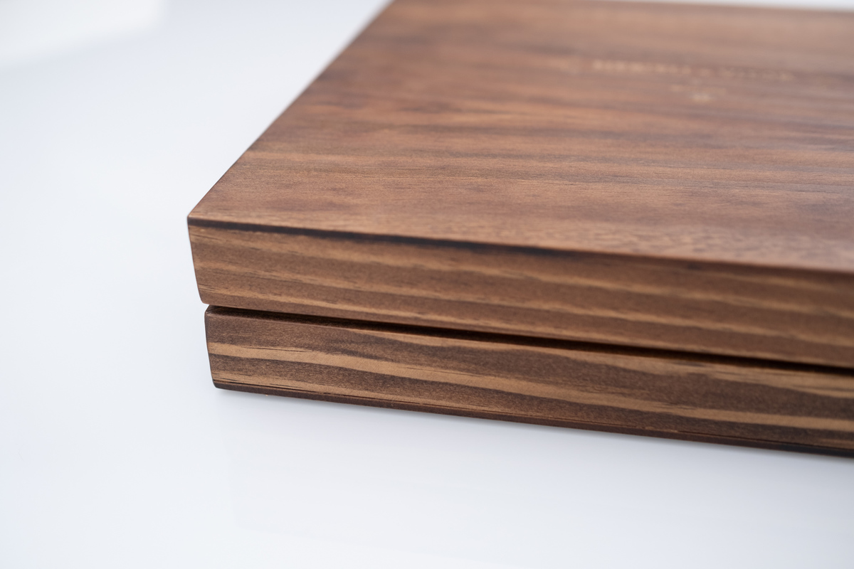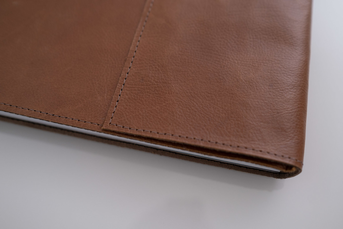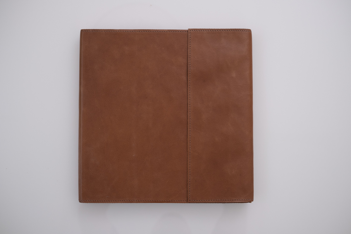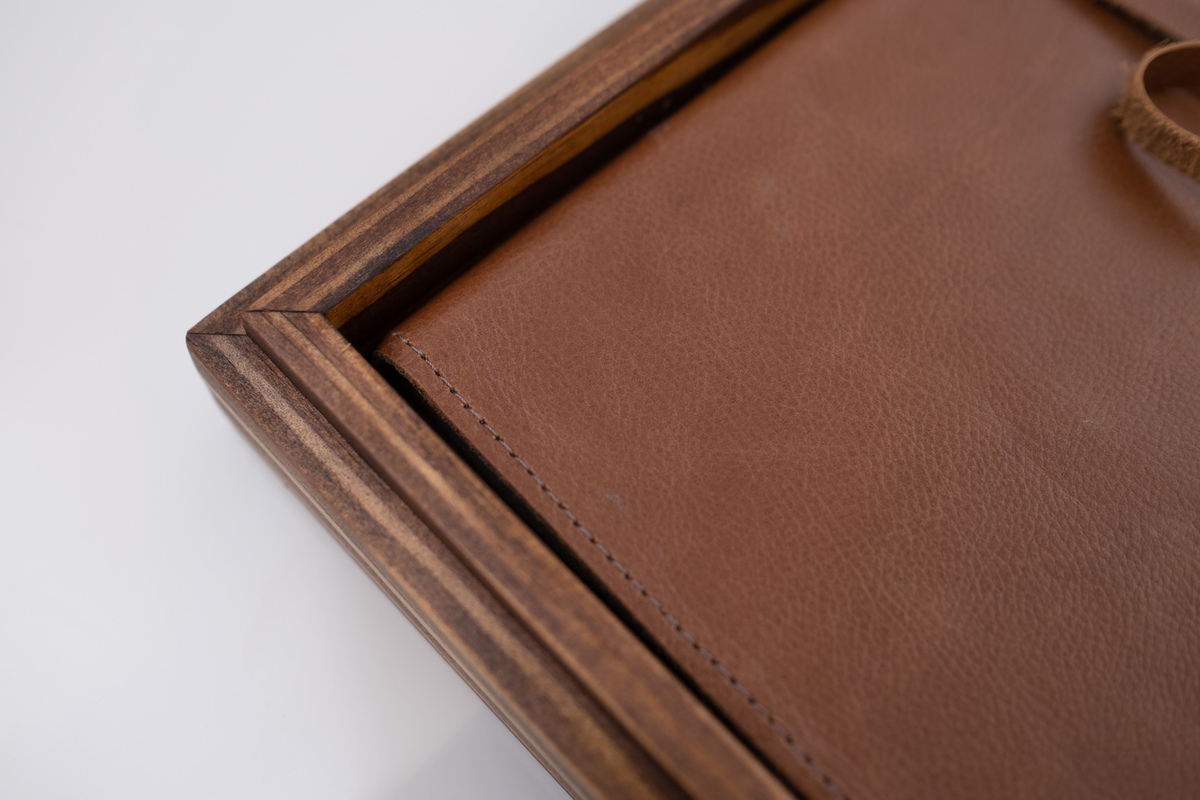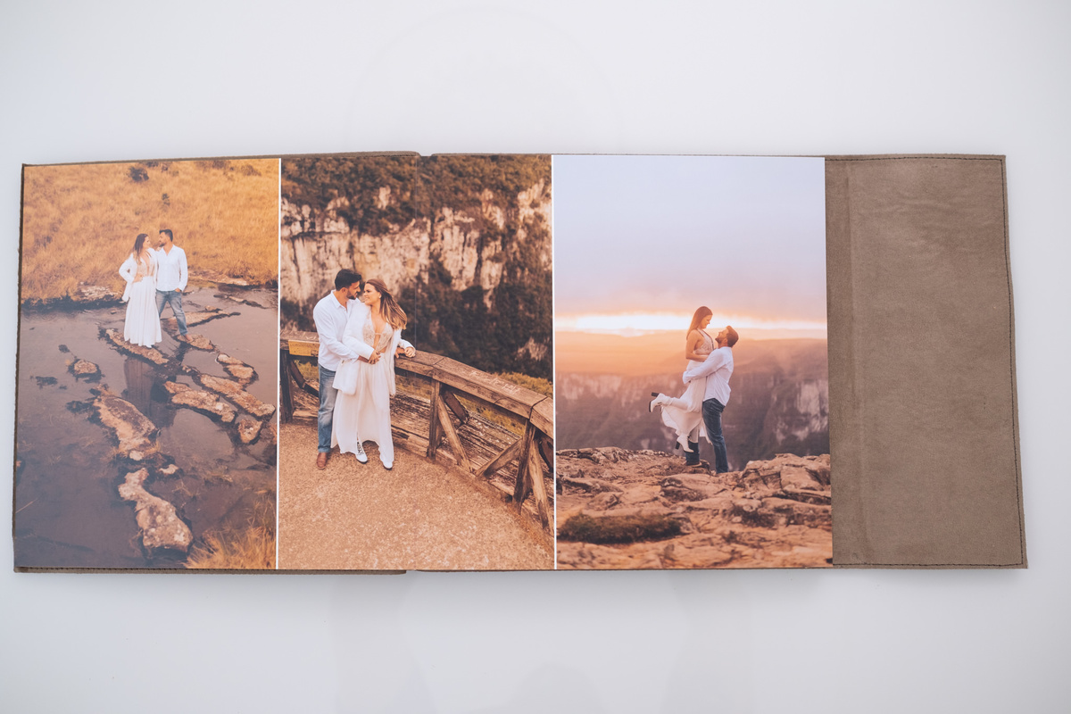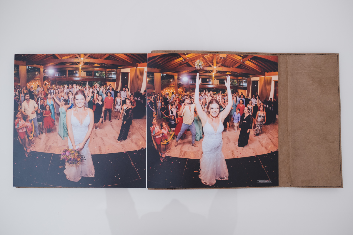 Álbum impresso em papel importado em São Paulo, medindo 30x60 cm aberto, com caixa em madeira e capa em couro legítimo.