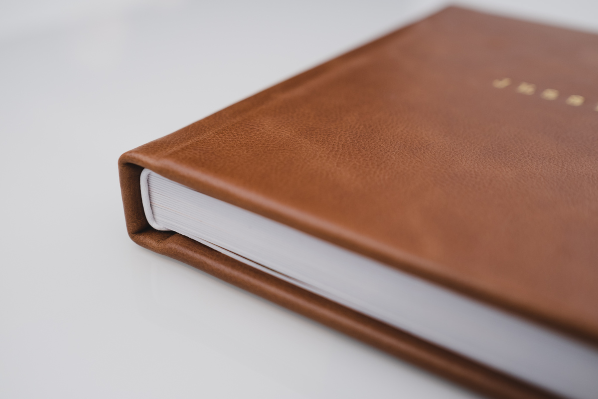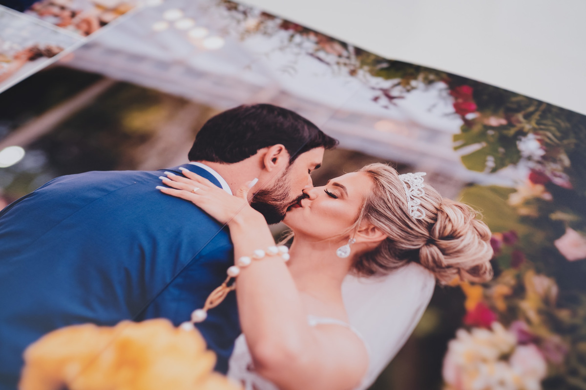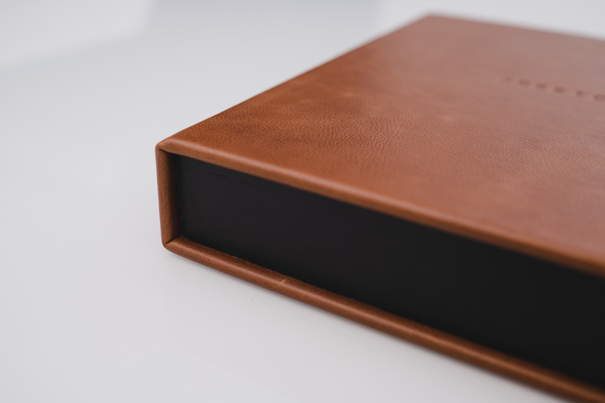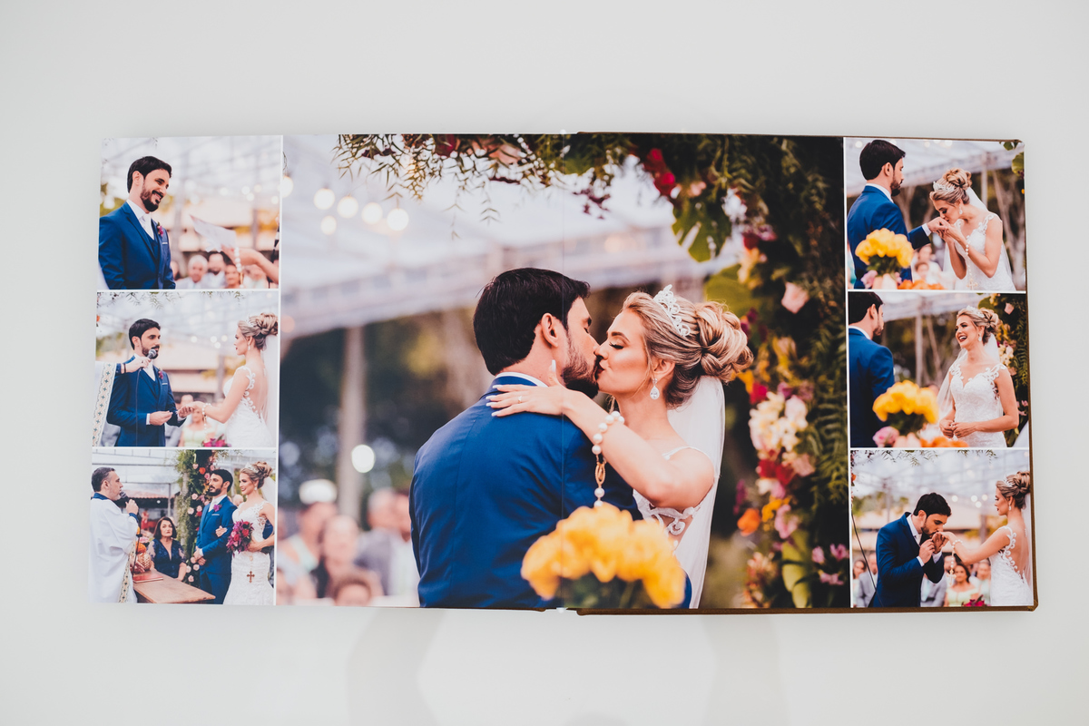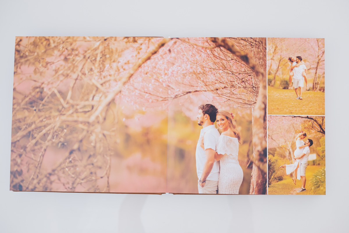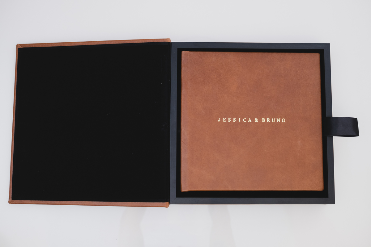 Álbum impresso em papel importado de alta gramatura em São Paulo, com caixa e capa em couro legítimo.